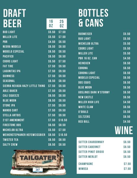 Regardless of what kind of beer you like, we know that you’ll enjoy one of the options we have on tap. We currently have 24 beers on tap, including Pacifico, Coors Light, Miller Lite, Sierra Nevada, Lagunitas IPA, Stella Artois, Guinness, Firestone 805, Fat Tire, Able Baker, Bubble Stash, Salty Crew and more. You can have us pour your favorite craft beer or try something new. Either way, The Tailgater Tavern has you covered.